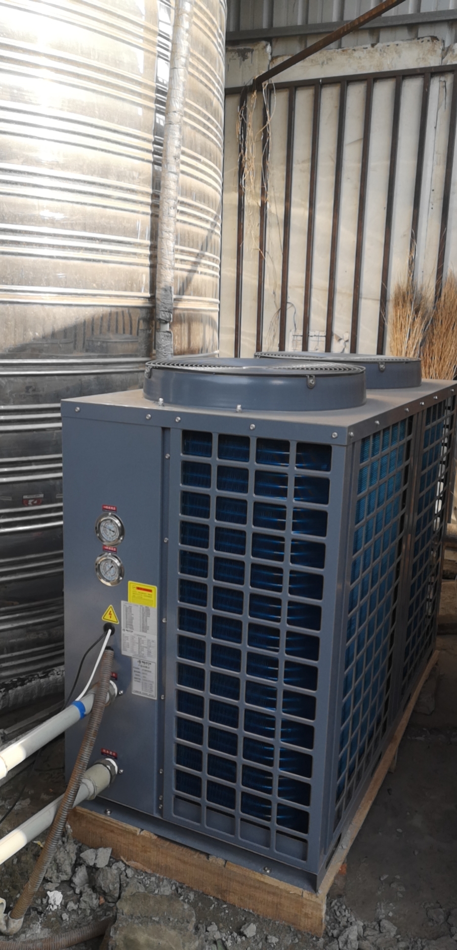 成都市青白江区清泉学校热水工程,安装1台10匹空气源热泵热水机组,每天为学生供应8吨生活热水。
